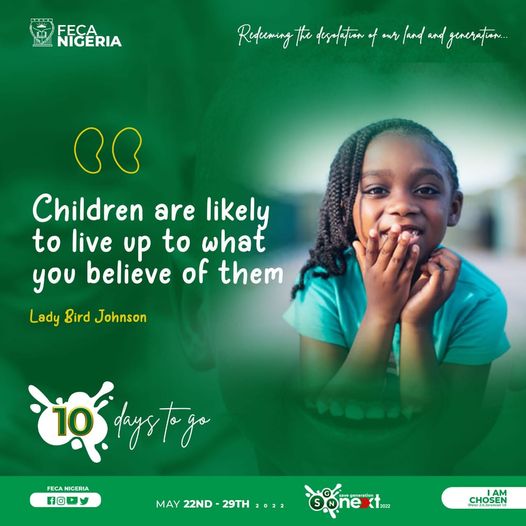 Save Generation Next usually spans for a period of one week. The week that SGN falls in is usually in the week that Children's Day is being celebrated. For instance, 2022 SGN was celebrated from the 22nd to the 29th of May and Children's Day is usually on the 27th of May. The theme of the 2022 Save Generation Next in FECA Nigeria was "I am Chosen".