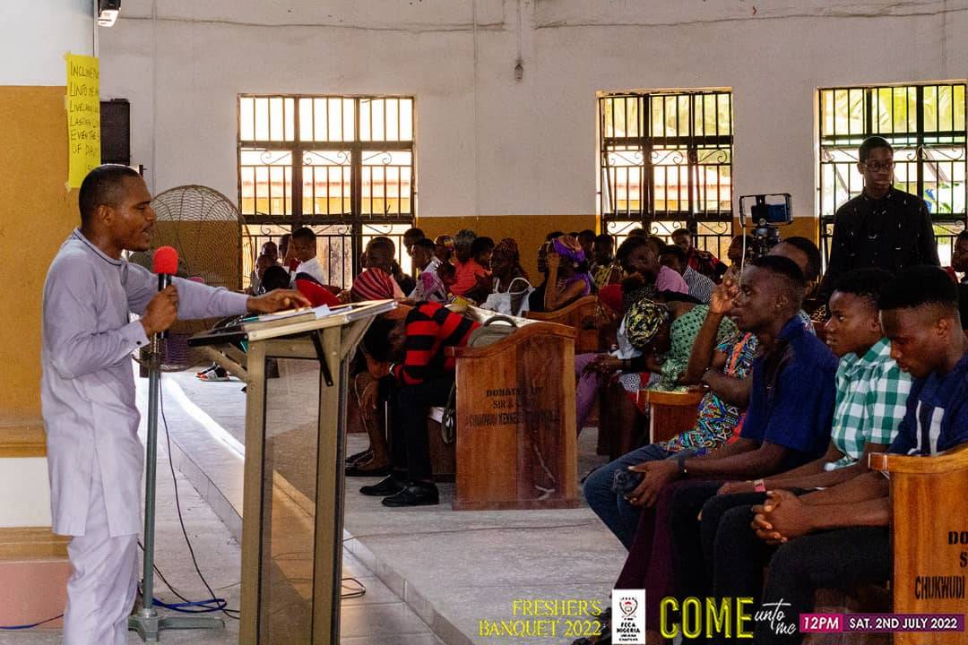 Image of the speaker, during Freshers banquet, 2022 in Azikiwe Road chapter.