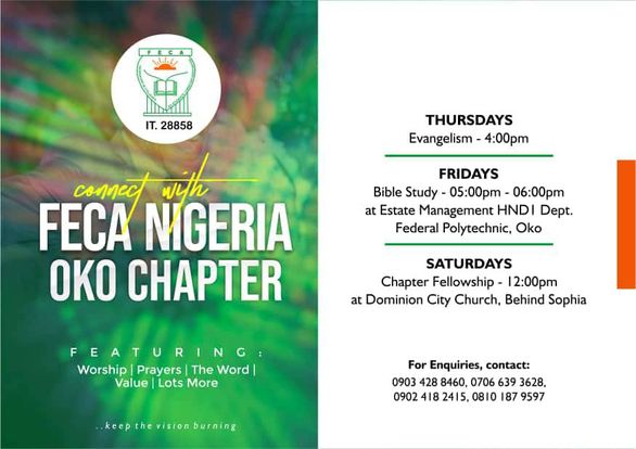 One of the newly inaugurated chapters in Eastern region of FECA Nigeria, Light Chapter, is about to host her first ever Freshers Banquet in July. The chapter is located at Dominion City Church, Behind Sophia Eatery, opposite Oko Micro Finance Bank, Federal Polytechnic, Oko.