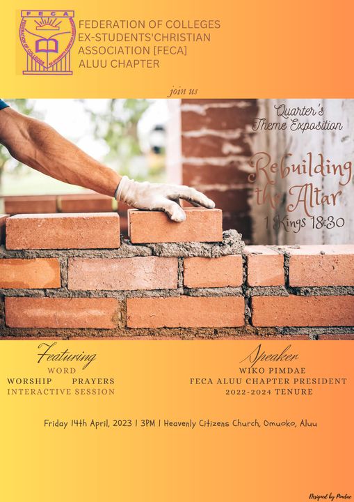 "From the beginning, men and women (some even younger than we are), labored (in the most difficult of times) to establish FECA in the community of Aluu. Since then, FECA Aluu Chapter have through the redeeming of land and generation, raised young men and women to be worshipers of God. The success story of FECA Aluu Chapter will not have been told if the 'Altar' (of Prayer, Word Study, Outreach and Love) had not been carefully built. Sadly, over the last few years, we have seen the gradual breaking of this Altar. In this quarter, it is expected of us to embrace our roles as the SENT ONES at this time, as we seek to 'REBUILDING THE ALTAR' that will stand the test of time in Redeeming Desolation."