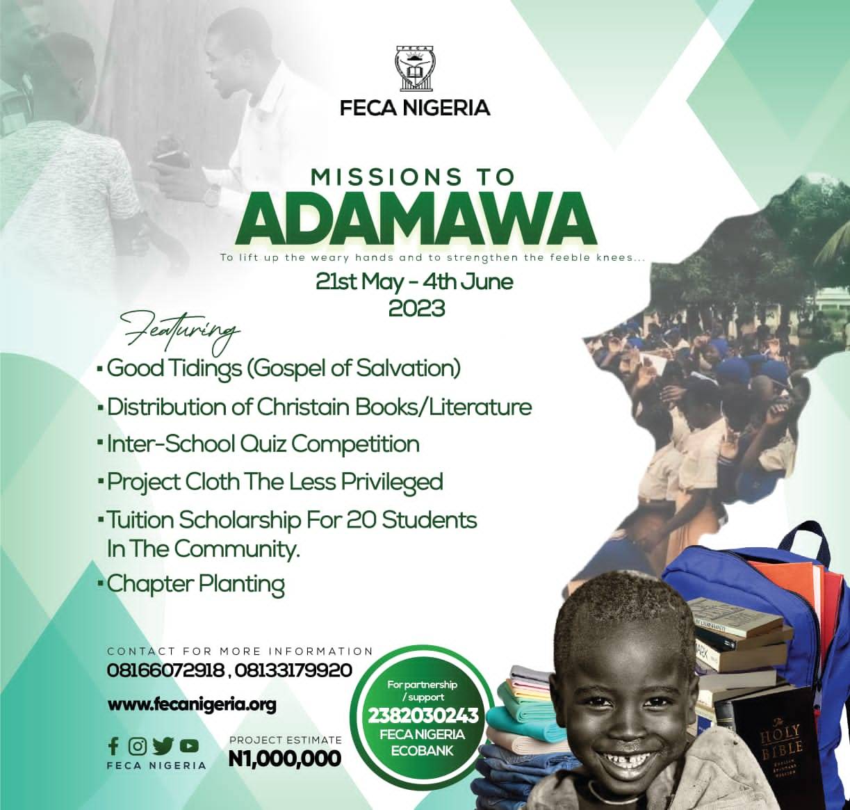 Join the train by supporting FECA Nigeria on the Adamawa Missions! You can support thus: ECOBank, 2382030243 (FECA Nigeria).