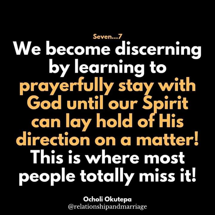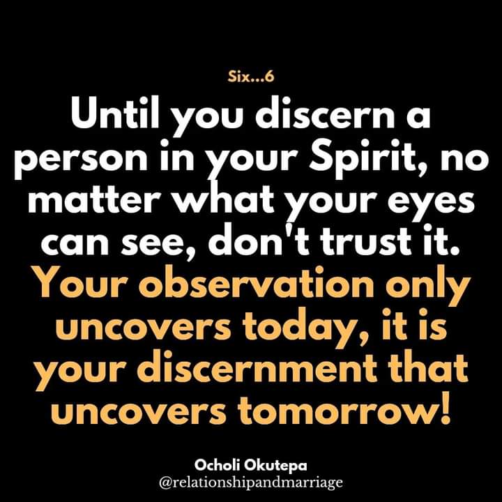 5. Through divine revelation or spiritual discernment. Last but very important, your ability to know the right person is tied to how functional your spiritual senses are. Adam could spiritually discern the woman as his bone of bones and flesh of flesh. The Bible didn't tell us that he dreamt or saw visions, there was a knowing in his heart that was deep enough and it was beyond her physical appearance, material possessions or personality impression - it is called discernment.