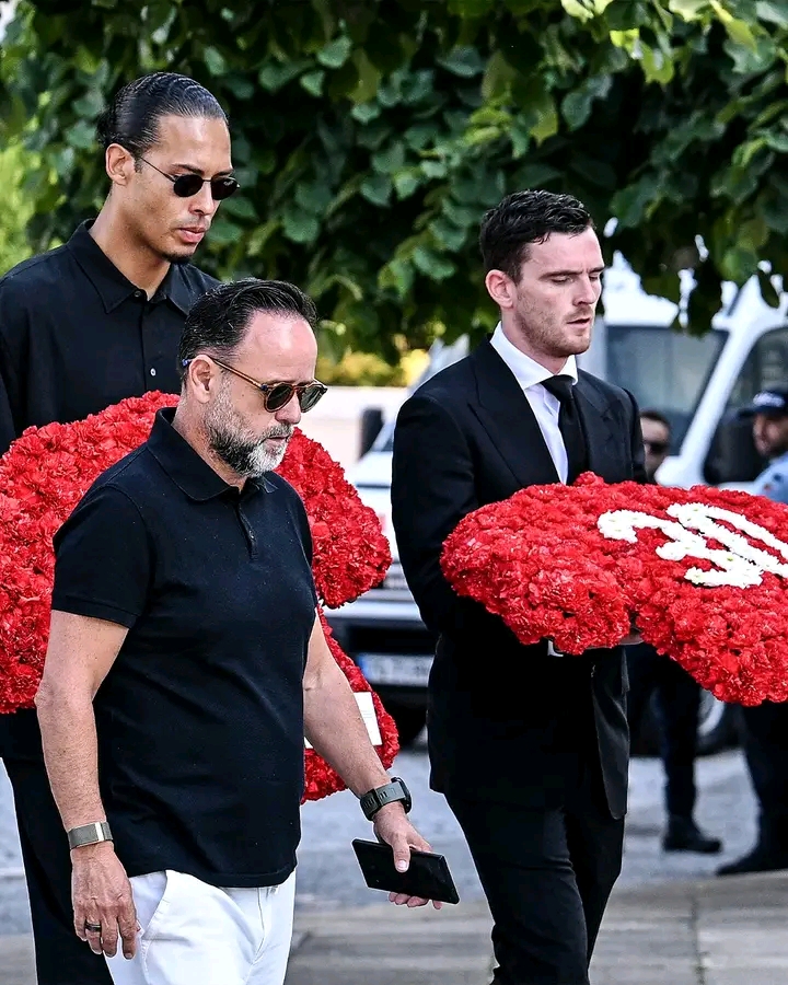 Liverpool’s delegation: Captain Virgil van Dijk, manager Arne Slot, Andy Robertson, Conor Bradley, Ryan Gravenberch, Cody Gakpo, Curtis Jones, Darwin Nunez, and Joe Gomez, among others, arrived in silence, carrying floral tributes shaped like football shirts—one with Jota’s iconic number 20, another with Andre’s number 30.