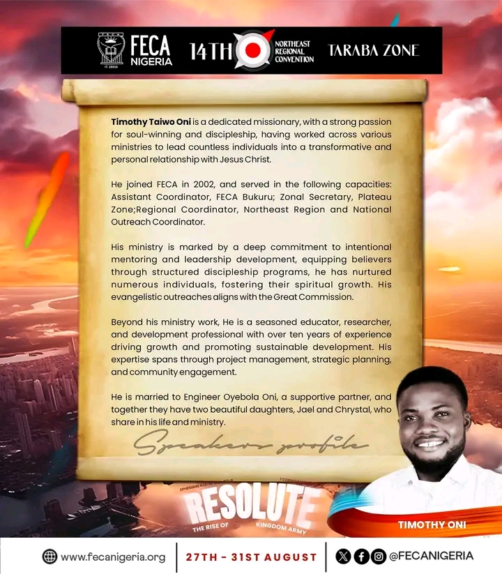 In Taraba State, the North East Region will gather under the banner of Resolute — and few fit this theme more than Timothy Taiwo Oni. A dedicated missionary and soul-winner, Timothy joined FECA in 2002 and served in several impactful roles: Assistant Coordinator of FECA Bukuru, Zonal Secretary of Plateau Zone, Regional Coordinator for the North East Region, and National Outreach Coordinator.